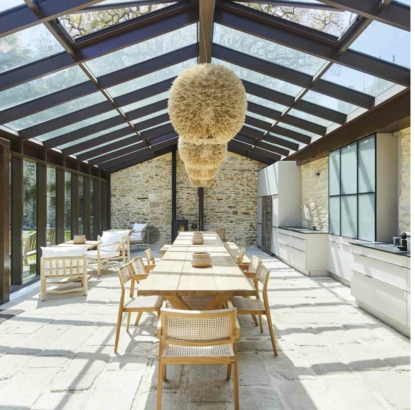 Cuisine sous verrière avec salle à manger attenante, ouverte entièrement sur l’extérieur.